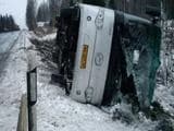 Как сообщают финские СМИ, ДТП произошло рано утром на трассе номер 6 у местечка Пюхяселя. По данным дорожной полиции, на скользкой дороге прицеп лесовоза, съезжавшего с шоссе, перевернулся, и из него высыпались бревна. Аварийный прицеп попытались объехать другой машины – грузовик, несколько легковушек и автобус с российскими туристами. Однако при выезде на встречную полосу водитель туристического автобуса не справился с управлением, машина перевернулась и опрокинулась в кювет.