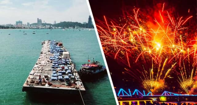 Гигантская баржа с фейерверками прибыла в Паттайю: на пляже началась грандиозная пальба, привлекая тысячи туристов