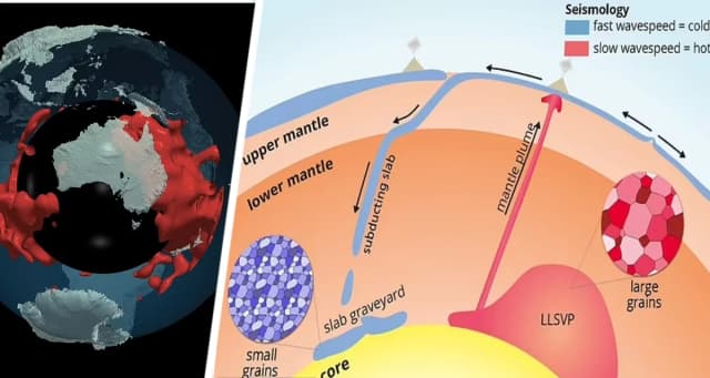 Открыть их помогло изучение того, как сейсмические ударные волны от землетрясений распространяются по недрам планеты. Когда происходит мощное землетрясение, оно звонит по Земле, словно колокол, посылая волны, распространяющиеся с одной стороны планеты на другую. Но когда эти волны проходят через что-то плотное или горячее, они замедляются, ослабевают или вообще отражаются. И вот, прислушиваясь к этому «звону» исследователи и обнаружили две огромные области мантии, где ударные волны резко замедляются, называемые Большими областями с низкой сейсмической скоростью (LLSVP). Это говорит о том, что горы состоят из гораздо более крупных зерен, чем окружающие их плиты, поскольку они не поглощают столько энергии от проходящих сейсмических волн.