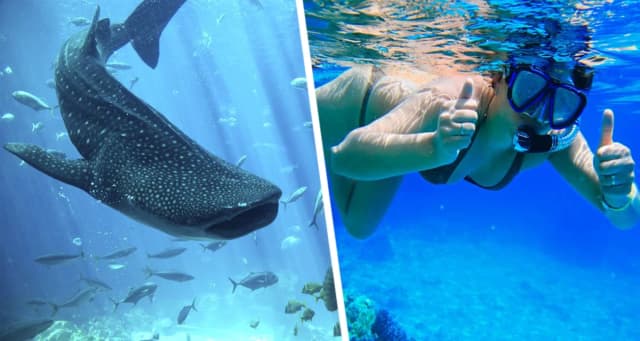 Китовая акула считается неагрессивным видом, поэтому дайверы смело плавают рядом с ней. Это самая крупная акула, обитающая в теплых океанах и морях, и находится под угрозой исчезновения. В среднем она весит 21 тонну и достигает 13 метров в длину, а продолжительность ее жизни составляет до 70 лет. По словам экспертов, этот медлительный вид появился около 60 миллионов лет назад и, несмотря на огромные размеры и большой рот, питается планктоном, микроскопическими водорослями, мелкими животными и рыбой, подобно китам. Несмотря на миролюбивый характер китовой акулы, известны случаи травм, полученных ныряльщиками от удара ее хвоста. Специалисты советуют не преграждать путь акуле и не пытаться за нее держаться.