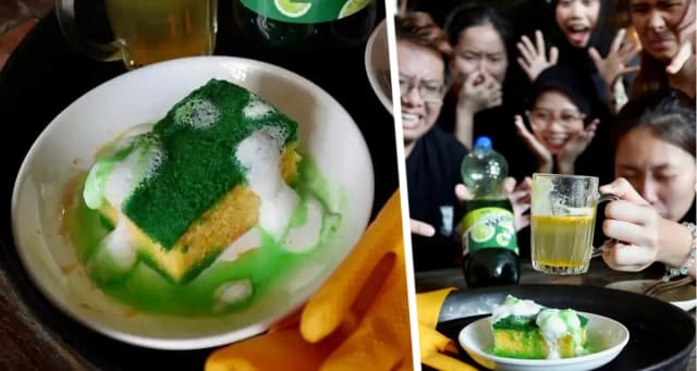 На самом деле, десерт представляет собой желто-зеленый бисквит, искусно декорированный в виде губки для мытья посуды. Среди вкусов — бисквит с лимонным маслом, английским апельсиновым мармеладом и лимонной пеной. «Моющее средство» — сироп пандан-лайма. К этому бесплатно предлагают «грязную воду» - но на самом деле напиток представляет собой коктейль на основе имбирной воды и кокосового молока с куркумой.