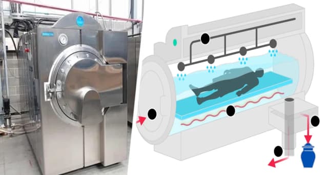 Метод официально известен как «водная кремация или щелочной гидролиз» и подразумевает быстрое разложение трупа в воде и щелочных химикатах при высоких температурах, в результате чего остаются только жидкость и кости. Жидкость, называемая «стоками», сливается в канализацию вместе с другими сточными водами, а кости можно измельчить, чтобы скорбящие родственники могли забрать их домой.