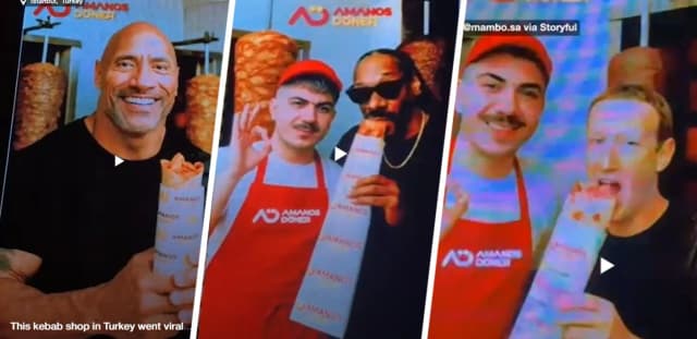 Хозяева турецкой забегаловки в Стамбуле стали «героями дня» в соцсетях за свою рекламу — но вряд ли так, как планировали. «Кебабный скандал» разгорелся после того, как выяснилось, что местную забегаловку «рекламировали» Дэвид Бекхэм, Дуэйн «Скала» Джонсон, Цукерберг и Снуп Догг. Разумеется, с помощью работы искусственного интеллекта.